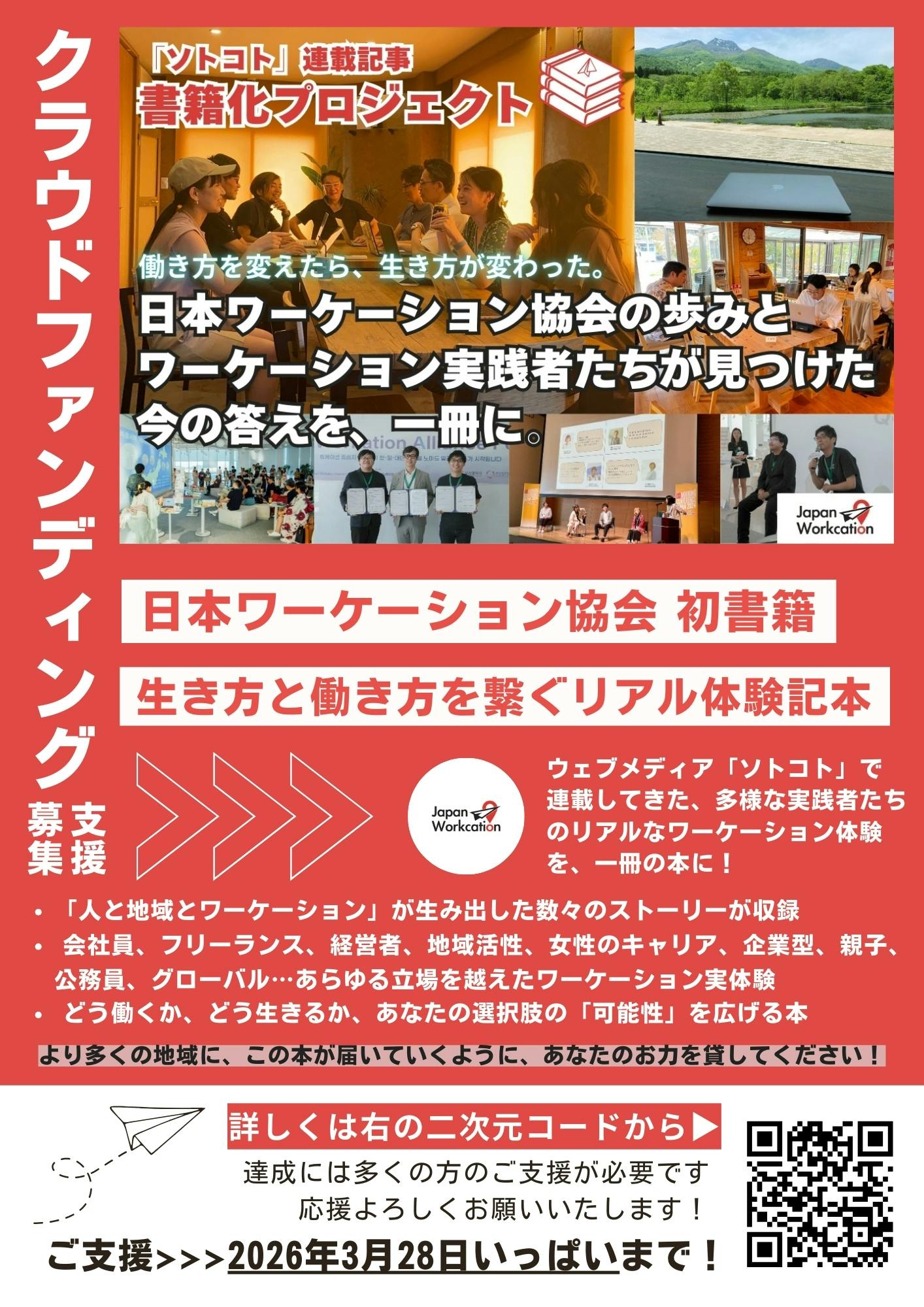 2026/02/16 15:29こんにちは!日本ワーケーション協会の挑戦を応援いただき、誠にありがとうございます。毎日少しずつ少しずつ温かな支援と、応援コメントが増えております。とても励みになります!引き続きよろしくお願いいたします…!本プロジェクトを見て「チラシがあったら置くよ!」「宣伝ポスター貼るよ!」という素敵なお声掛けを頂いておりまして、早速ではございますが作ってみました!=====◆チラシ(Googleドライブリンク)https://drive.google.com/drive/folders/1nJWVhdQefLCkXffFlSd52tK5-gt12pMR?usp=sharing※自由に印刷等を行なってご活用ください。※WEB向けのJPGと、印刷向けのPDFをご用意しております。※A規格なのでA4サイズ・A3サイズ等に対応しております。=====コワーキングやコリビング、カフェや事務所などワーケーション関連施設等を運営されている方いらっしゃいましたら、ぜひ貼り出しのご協力をいただけると大変嬉しいです…!!僭越ながら、貼っていただけましたら、ぜひSNS等でお知らせいただけますとさらにさらに嬉しいです!(日本ワーケーション協会をタグ付け、ハッシュタグ付け大歓迎です!!)残り40日間、達成目指して頑張ってまいりますので、皆様どうか応援のほど、よろしくお願いいたします! もっと見る