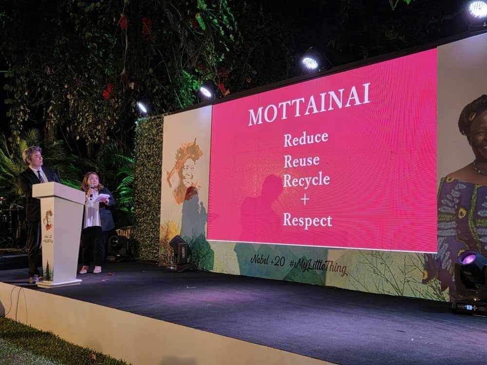 受賞から2カ月後に毎日新聞社の招きで日本を訪れたマータイさんは「もったいない」という日本語に出会い、感銘を受け、翌月、米ニューヨークの国連本部で開かれた会議で「この言葉を環境を守る世界の合言葉にしよう」と提唱しました。その呼びかけに応じてできたのがMOTTAINAIキャンペーン事務局です。