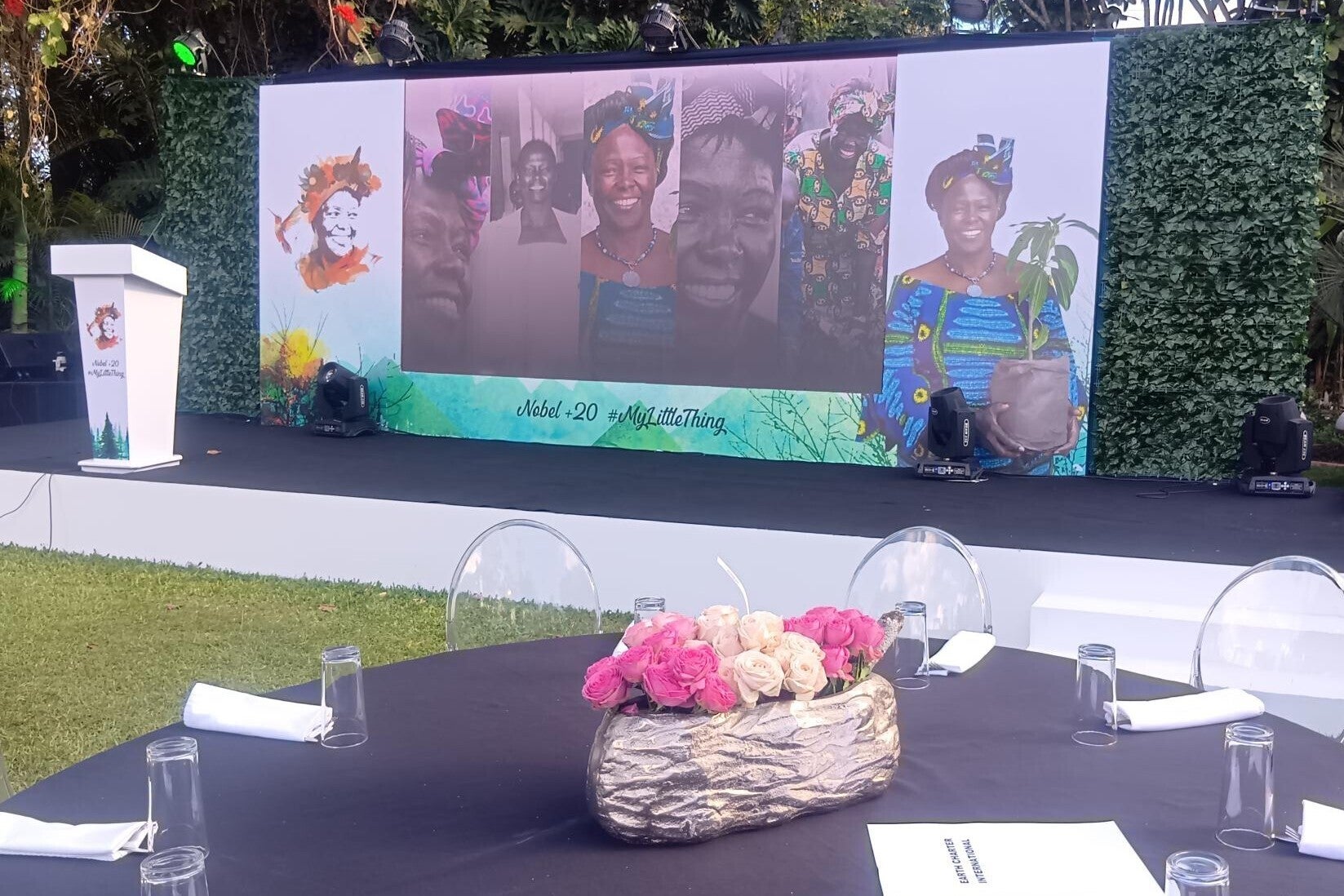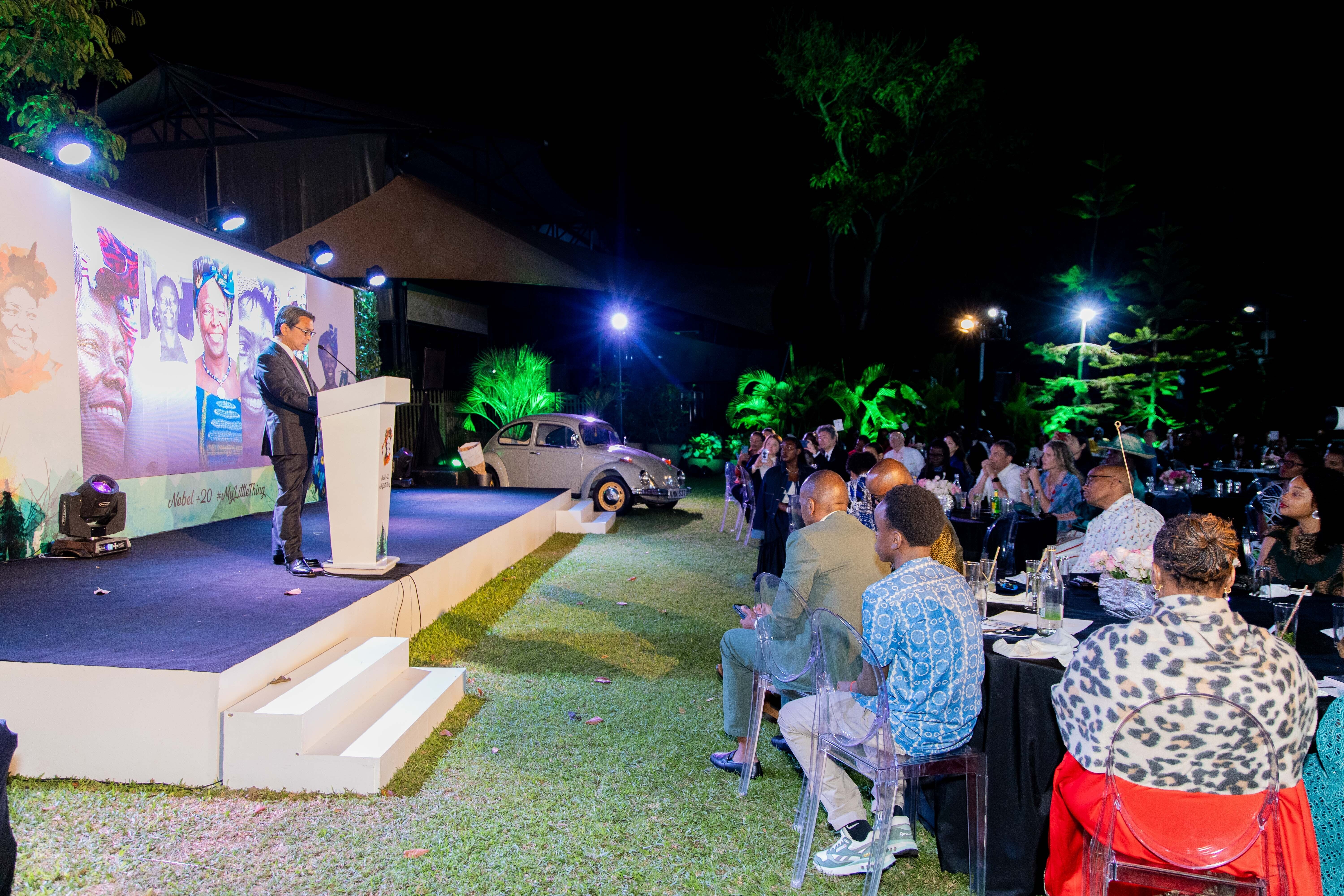 緑に囲まれた会場が漆黒の闇に包まれた時、ノーベル賞受賞時のマータイさんの力強い演説の動画が流れ、祝典が開始されました。挨拶に立ったワンジラさんは「彼女の声は時代を超えて今も切実で、生き生きとしています」と少し声を詰まらせながら、挨拶をしました。