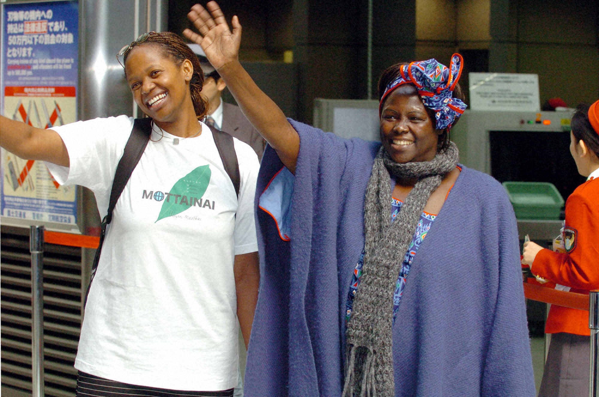 マータイさんとワンジラさん=2005年2月、成田空港で
