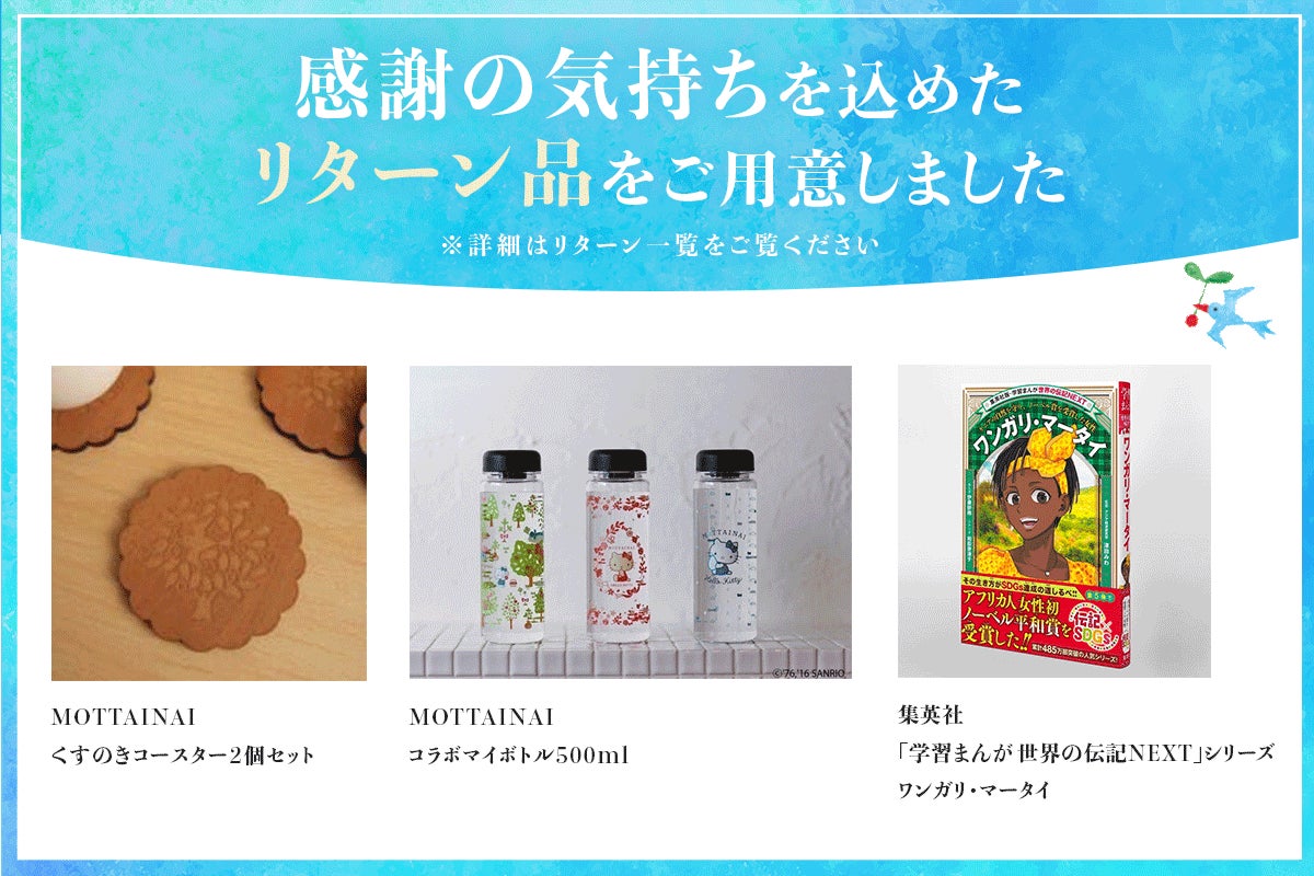 マイボトル、Tシャツなど、MOTTAINAIの文字が入ったライセンス商品やマータイさんの絵本をリターンとしてご用意しました。長女・ワンジラさんからの感謝のメッセージや活動レポートも用意します。