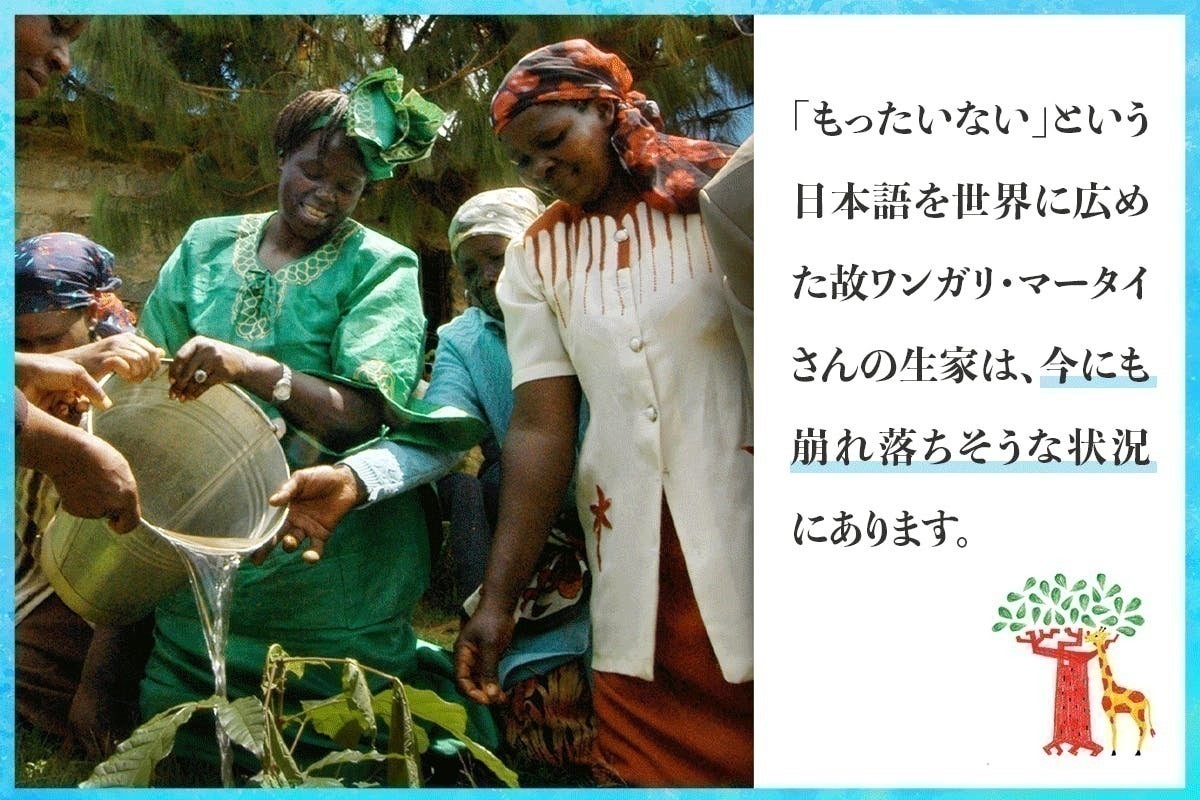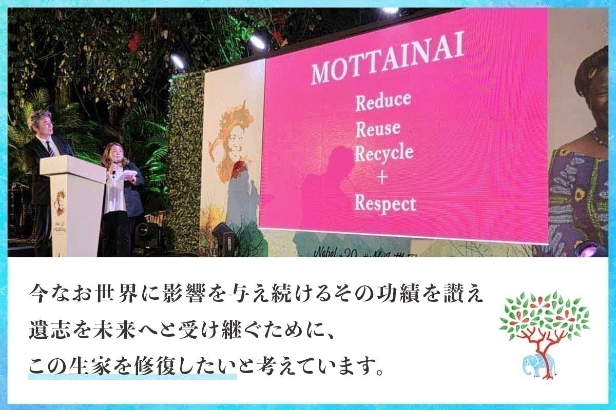「もったいない」という言葉の重みと地球環境を守る大切さを私たちに再認識させ、世界に発信し続けたマータイさん。日本と日本人をこよなく愛したマータイさん。彼女の活動の原点ともいえる生家を修復し、レガシー(遺産)を未来に引き継ぐ拠点にするため、皆さんのご協力をお願いします。