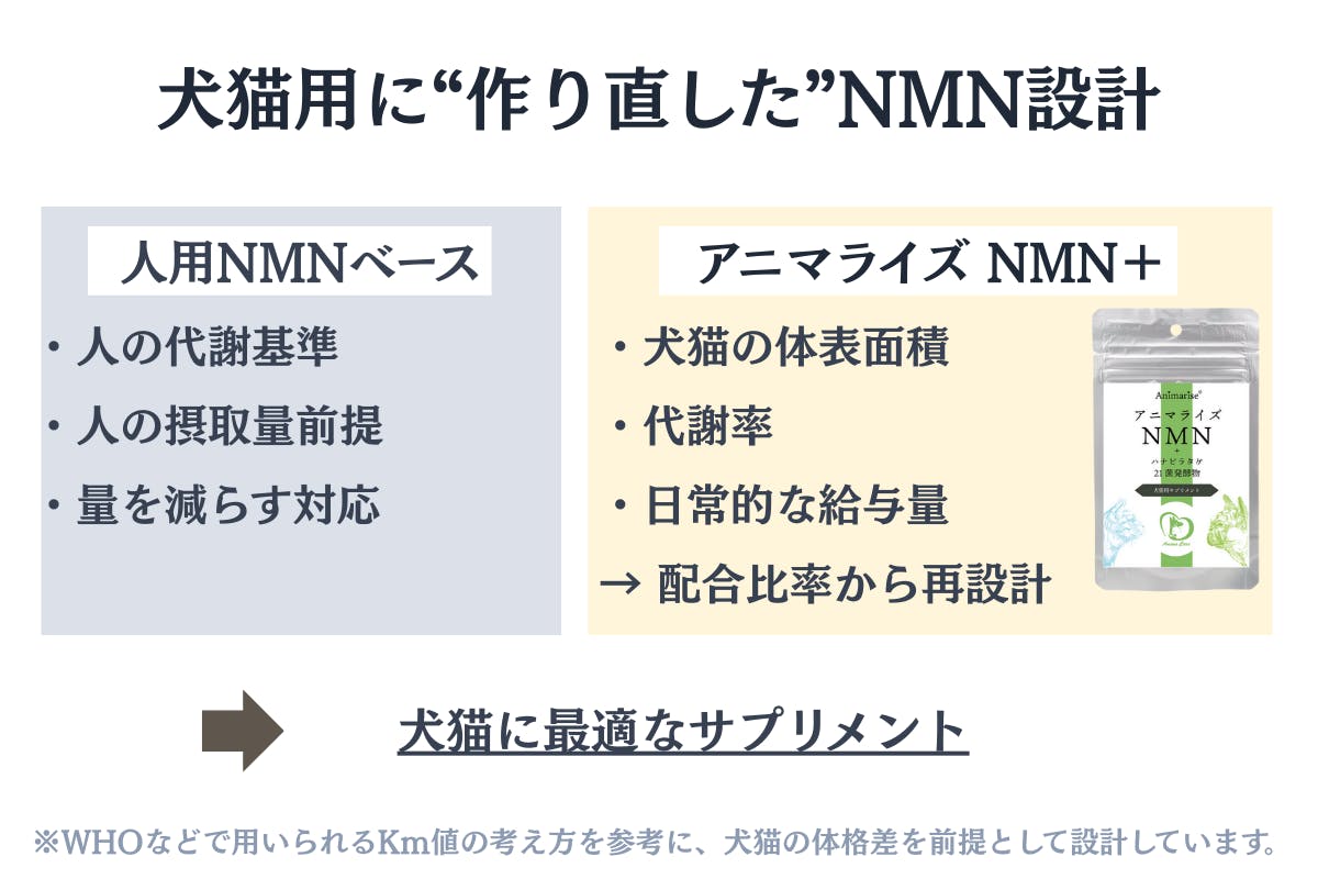 近年、NMN入りのペット用サプリメントは増えています。しかしその多くは、人用設計をベースにした配合思想で作られており、犬猫の体格・代謝特性・免疫感受性・日常的な給与量を前提に、配合比率そのものから設計されている製品は、決して多くありません。