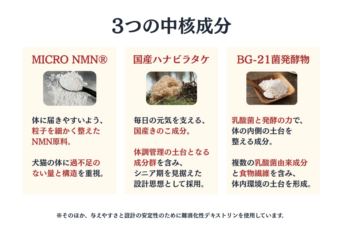 私たちが目指したのは、「NMNが入っていること」ではなく、犬猫の体にとって“本当に意味のある設計”をつくることでした。