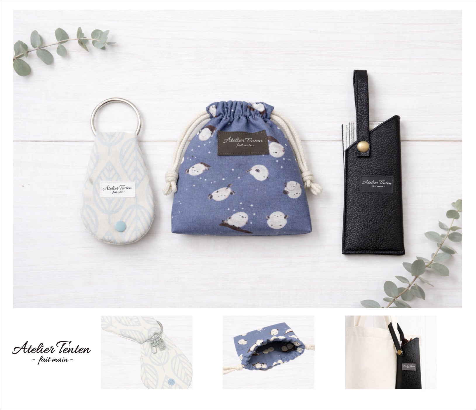 左からキーケース、巾着袋、メガネケース