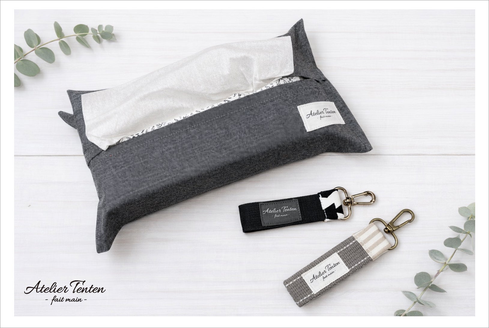 ティッシュケースとキーホルダーより1点お選びいただけます。