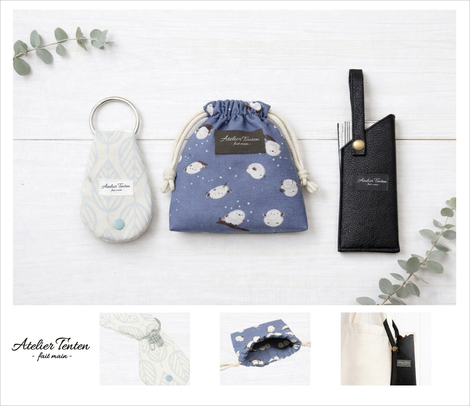 左からキーケース、巾着袋、メガネケース