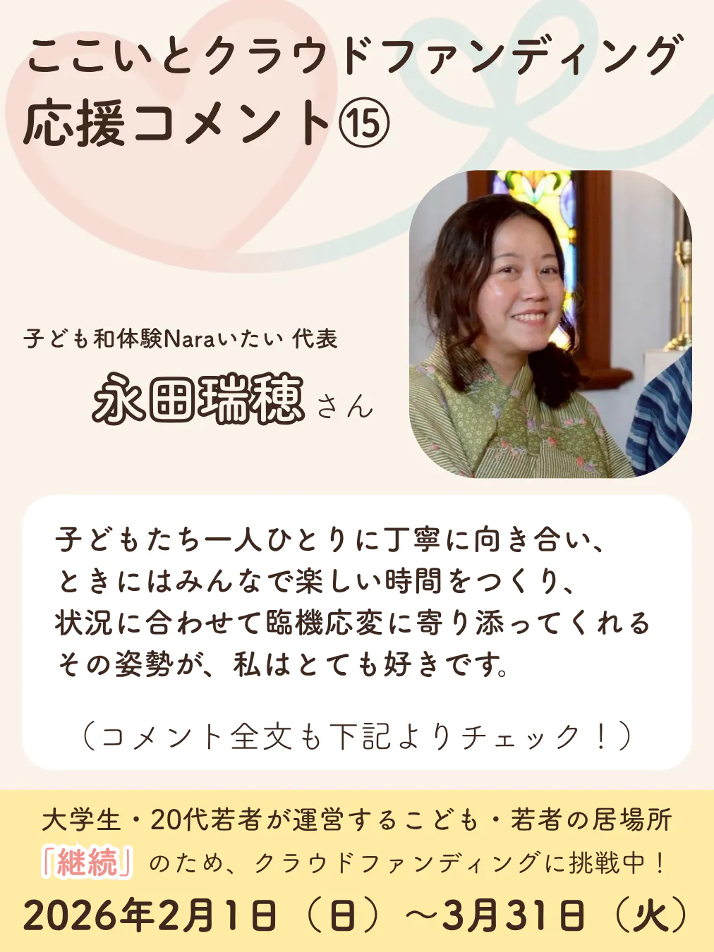 2026/03/29 07:30「ここいと」の活動への応援コメントをご紹介します。ーーー以下、応援コメント全文ーーー子ども和体験Naraいたい代表をしております。永田瑞穂です。田原本町では、不登校児親子の居場所づくり「ひなた雨」や、「子ども能楽教室」「こども向け和のワークショップ」などの活動を行っています。ここいとさんとは、毎週木曜日の学習会支援や、子ども向けワークショップを一緒にさせていただいています。ここいとさんと一緒に活動して感じるのは、様々な個性を持った“原石”のような若者が集まっているのに、それぞれがボランティアとして自分ができることを考えてくれていること。その姿勢が、あたたかく優しい空間を生み出しています。子どもたち一人ひとりに丁寧に向き合い、ときにはみんなで楽しい時間をつくり、状況に合わせて臨機応変に寄り添ってくれるその姿勢が、私はとても好きです。貴重な原石くん達が集まっているここいと。どうか、のびのびと、好きなように活動してもらえたらと願っています。そしてその活動は、今ここにいる子どもたちにも、これから出会う子どもたちにも、必ず必要とされるものです。心から応援しています。ーーー【子ども和体験Naraいたい 永田瑞穂さんについて】子ども和体験Naraいたいさんとは、学習会共催という形でご協力いただいています。夏には、浴衣を着て燈花会(奈良の夏のイベント)に行く企画をし、着付け等を行っていただくなど、ここいとだけでは出来なかった体験をすることが出来ました。ーーー【応援コメントに共感したらSNSでシェア!】クラウドファンディングの進捗や、ここいとの最新情報はインスタグラムからも発信しています!インスタグラムもぜひフォローお願いします!応援コメントはインスタグラムでも投稿しています。あなたが共感した投稿をストーリーズや、その他SNSでもぜひシェアしてください!クラファン期間中、たくさんの方に活動を知っていただきたいです。シェアで応援よろしくお願いします!▼ここいとインスタグラムhttps://www.instagram.com/place_cocoito もっと見る
