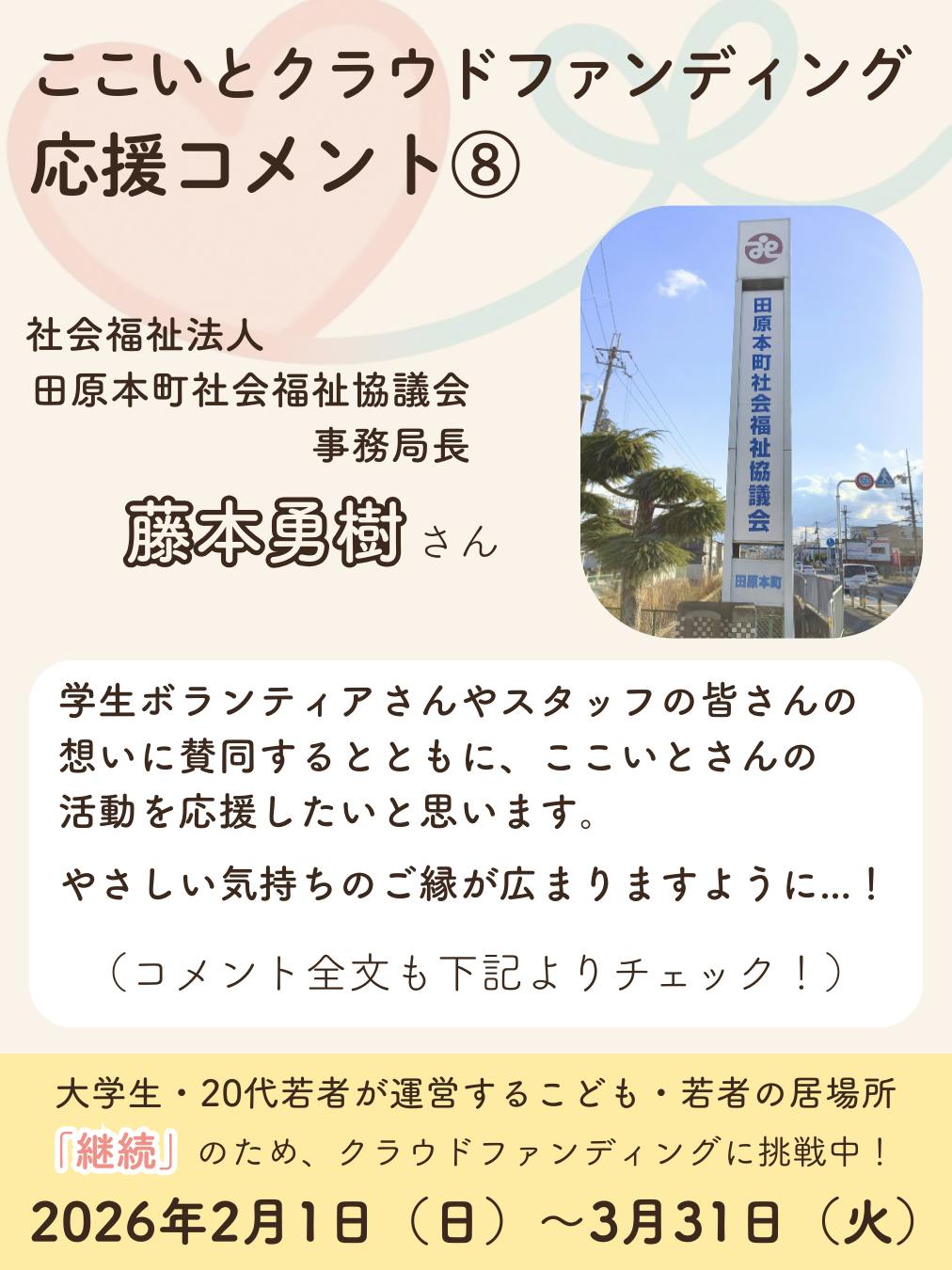 「ここいと」の活動への応援コメントをご紹介します。ーーー以下、応援コメント全文ーーー多世代、特に若い世代が主体的に行動され、実現しようとしていること、心より応援しています。何かお力になれることがあれば協力させてもらいますのでいつでも声をかけてください‼ーーーはっぴーふらっと代表 森戸佳世さんから、応援コメントをいただきました!森戸さんには、ここいと立ち上げの際に何度かご相談をさせていただきました。地元で子育てをされている視点、そして教員をされていたご経験から、さまざまな角度でアドバイスをいただき、今のここいとがあります。子育て世帯を中心に、子どもから大人まで【繋がれる】コミュニティづくりを実践されており、ここいとにとっても心強く、頼りにさせていただいている存在です。ここいとも、こどもたちがさまざまな世代の方とつながれる居場所であり続けられるよう、これからも活動を続けていきます!ーーー【応援コメントに共感したらSNSでシェア!】クラウドファンディングの進捗や、ここいとの最新情報はインスタグラムからも発信しています!インスタグラムもぜひフォローお願いします!応援コメントはインスタグラムでも投稿しています。あなたが共感した投稿をストーリーズや、その他SNSでもぜひシェアしてください!クラファン期間中、たくさんの方に活動を知っていただきたいです。シェアで応援よろしくお願いします!▼ここいとインスタグラムhttps://www.instagram.com/place_cocoito