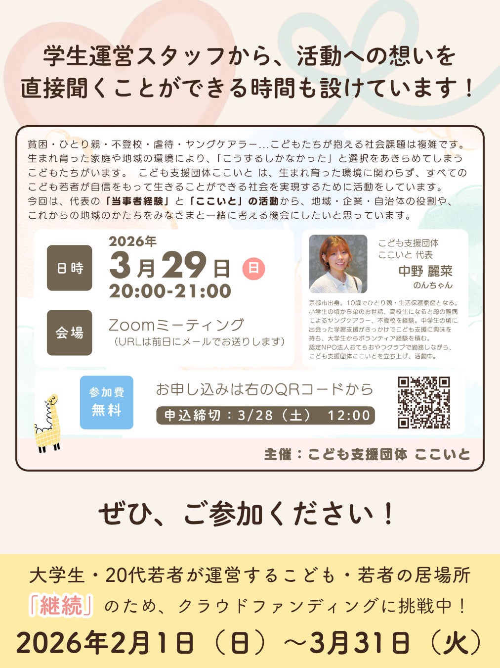 ★3/29(日)20:00〜開催!★ここいと オンラインイベント「こどもの未来は"偶然"で決まって良いのか?~こどもの体験格差と地域・企業・自治体の役割~」ーーー◆日時 3月29日(日)20:00~21:00◆場所 Zoom ※アーカイブ配信はありません◆申し込み(締切:3/28 12:00まで) 下記URLからお申し込みください https://forms.gle/mtqHkNRjZsdoHRSb6◆特にご参加いただきたい方 【参加費無料】 ・地域の方 ・地域貢献を考えている、おこなっている企業 ・行政関係者 ・教育、こどもの福祉に興味のある方 ・ボランティアを考えている学生ーーー代表の当事者経験の話やここいとの活動をもとに、「これからの地域のかたち」をみなさんと一緒に考えたいと思っています!ご参加お待ちしています!!