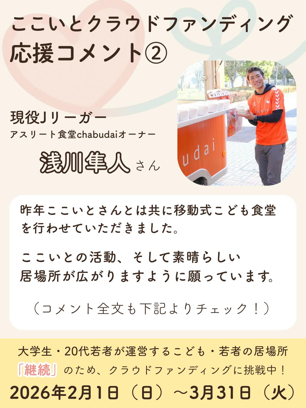 「ここいと」の活動への応援コメントをご紹介します。ーーー以下、応援コメント全文ーーー昨年ここいとさんとは共に移動式こども食堂を行わせていただきました。こども食堂だけでなくそれ以外の遊ぶ時間も通じてここいとの皆さんがこども達を第一に考え、寄り添い、共に遊んでくれたことで、より笑顔が溢れる場所となりました。これからも共に活動できたらと思います。ここいとの活動、そして素晴らしい居場所が広がりますように願っています。ーーー2025年12月に移動式こども食堂をここいとで開催していただいた、JリーグFC琉球所属の浅川隼人さんから応援コメントをいただきました!浅川さんは、「地域でこどもの健康を支え、共に育てる」という想いから、アスリート食堂chabudaiにて移動式こども食堂の活動を続けておられます。奈良クラブ所属時代に始まったこの取り組みを、沖縄で活躍される今も変わらず続けてくださっていることに、深いあたたかさと行動力を感じています。浅川さんとの取り組みを通して、こどもたちが地域や社会とつながるきっかけが生まれていることを、とても心強く感じています!ーーー【応援コメントに共感したらSNSでシェア!】クラウドファンディングの進捗や、ここいとの最新情報はインスタグラムからも発信しています!インスタグラムもぜひフォローお願いします!応援コメントはインスタグラムでも投稿しています。あなたが共感した応援コメントをストーリーズや、その他SNSでもぜひシェアしてください!クラファン期間中、たくさんの方に活動を知っていただきたいです。シェアで応援よろしくお願いします!▼ここいとインスタグラムhttps://www.instagram.com/place_cocoito