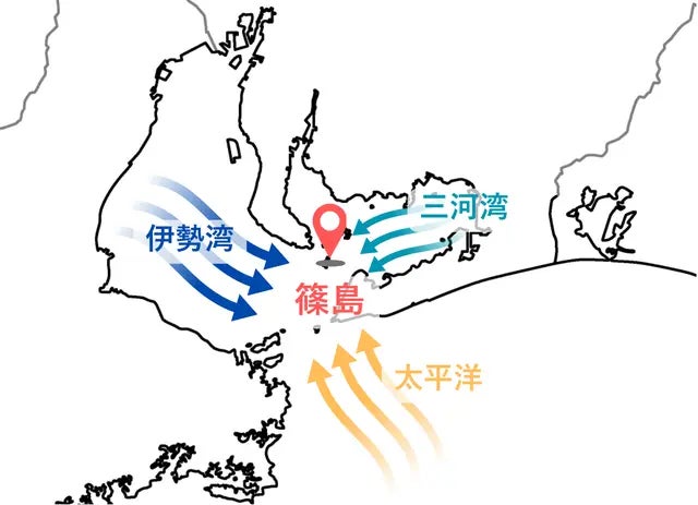 篠島の周辺は三河湾や伊勢湾、太平洋の黒潮が入り乱れる複雑な漁場。河川が運ぶ栄養塩や水質の混合、潮流、浅瀬の地形などが相互作用し、プランクトンが豊富に発生します。そのためこの海域は日本屈指のしらす漁場となっており、獲れるしらすは大きく、甘み、旨みが強いのです。