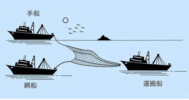 篠島では船びき網漁でしらす漁を行います。2隻の漁船が網の両端を引きながら魚を囲む形で行うこの漁法は、群れを成して生息するしらすを一度に広範囲に渡って魚の逃げ道を遮断することができ、効率的な捕獲が可能です。またしらすへのダメージも少ないのが特徴です。