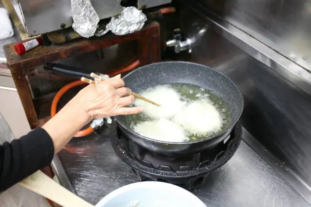 揚げ油を170~180℃に熱します。衣を絡めた生しらすをスプーンですくい、少量ずつ油に入れて揚げます。衣がカリッときつね色になるまで(約2~3分)揚げたら、油を切ります。