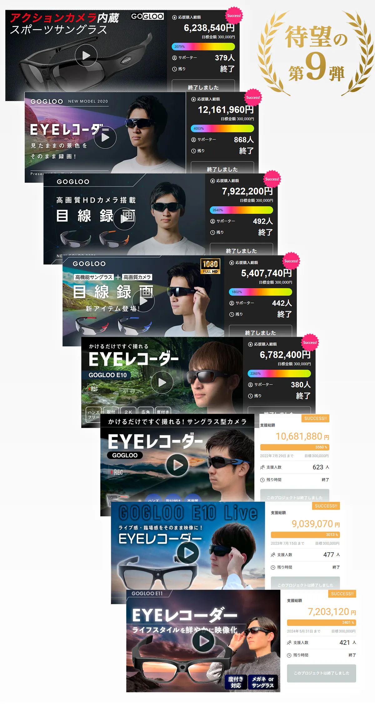 GOGLOOはこれまでに、スマートグラス型カメラシリーズ(E7/E9/E10/E11)を中心に、国内のクラウドファンディングで8回成功させてきました。