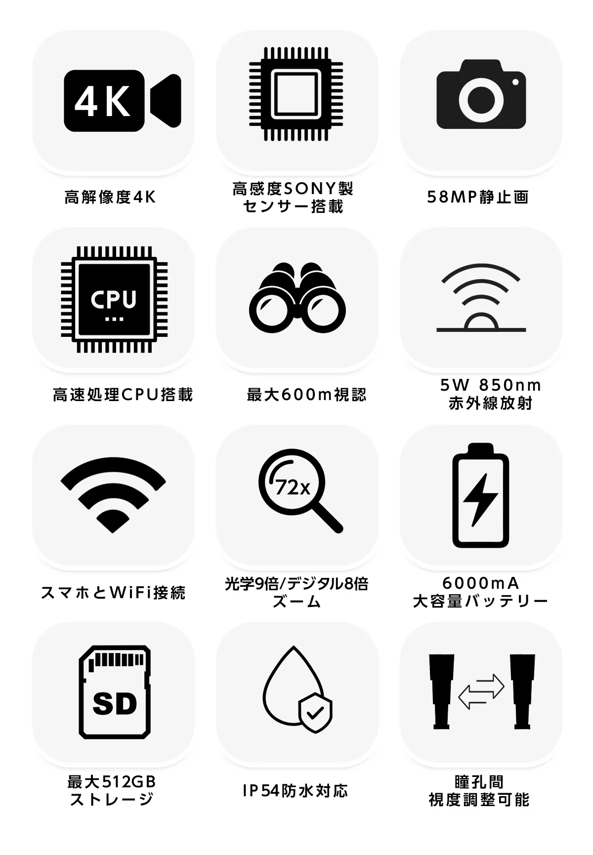 最大72倍まで認識できる望遠性能、暗闇を照らす赤外線暗視、そして4K高画質録画を、1台に凝縮した次世代双眼鏡です。