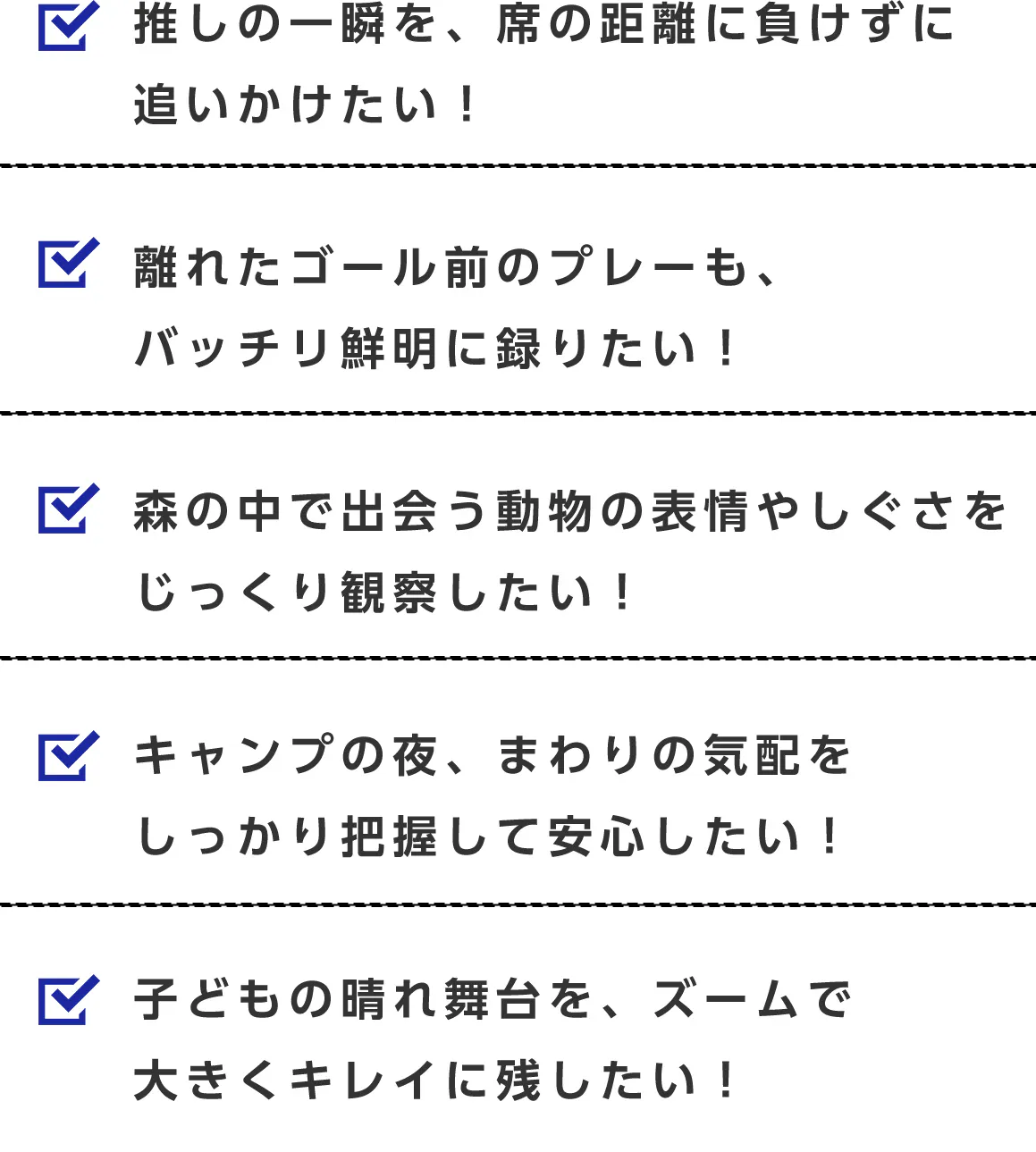 A. コンサートやスポーツ観戦、野生動物観察、夜間監視、キャンプ、災害時の安全確認など幅広く活用いただけます。