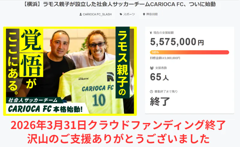 2026/03/20 10:40CARIOCA FCのクラウドファンディングが、目標の100%を達成いたしました!多大なるご支援、そして温かいメッセージを届けてくださった皆さま、本当にありがとうございます。この達成は、皆さまと共に掴み取った「一歩」です。私たちの挑戦はここで終わりではありません。「仕事とサッカーの両立」を掲げ、夢を追う若者たちがさらに輝ける場所を作る。その決意を形にするため、私たちは「ネクストゴール」への挑戦を決めました。選手たちの成長のために、いただいた想いを全力で還元してまいります。プロジェクト終了の3月31日まで、走り抜けます。共感の輪を広げていただけるよう、シェアや拡散での応援も心強い支えとなります。結果で恩返しをすることをお約束します。これからのCARIOCA FCに、ぜひご注目ください。CARIOCA FC代表兼監督ラモス ファビアノ もっと見る【メディア掲載】CARIOCA FCクラファン情報