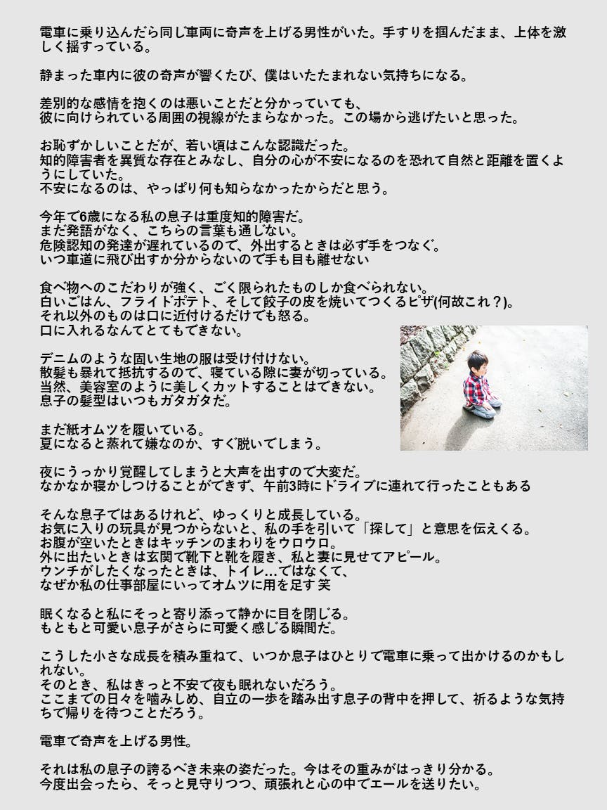 その一方で、私にはもうひとつの顔があります。知的障がいのある子どもの父親としての顔です。