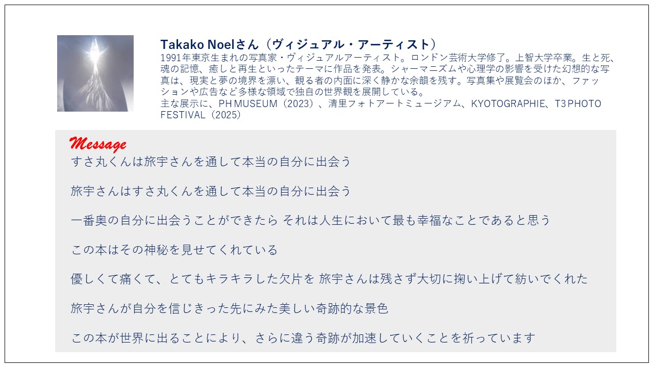 2024年、東京・渋谷ヒカリエで開催された写真展『その視線たちの真ん中に立つと』(Borderless Kids × Takako Noel )にモデルとして参加させていただきました。すさ丸が繋いでくれた素晴らしいご縁に感謝!