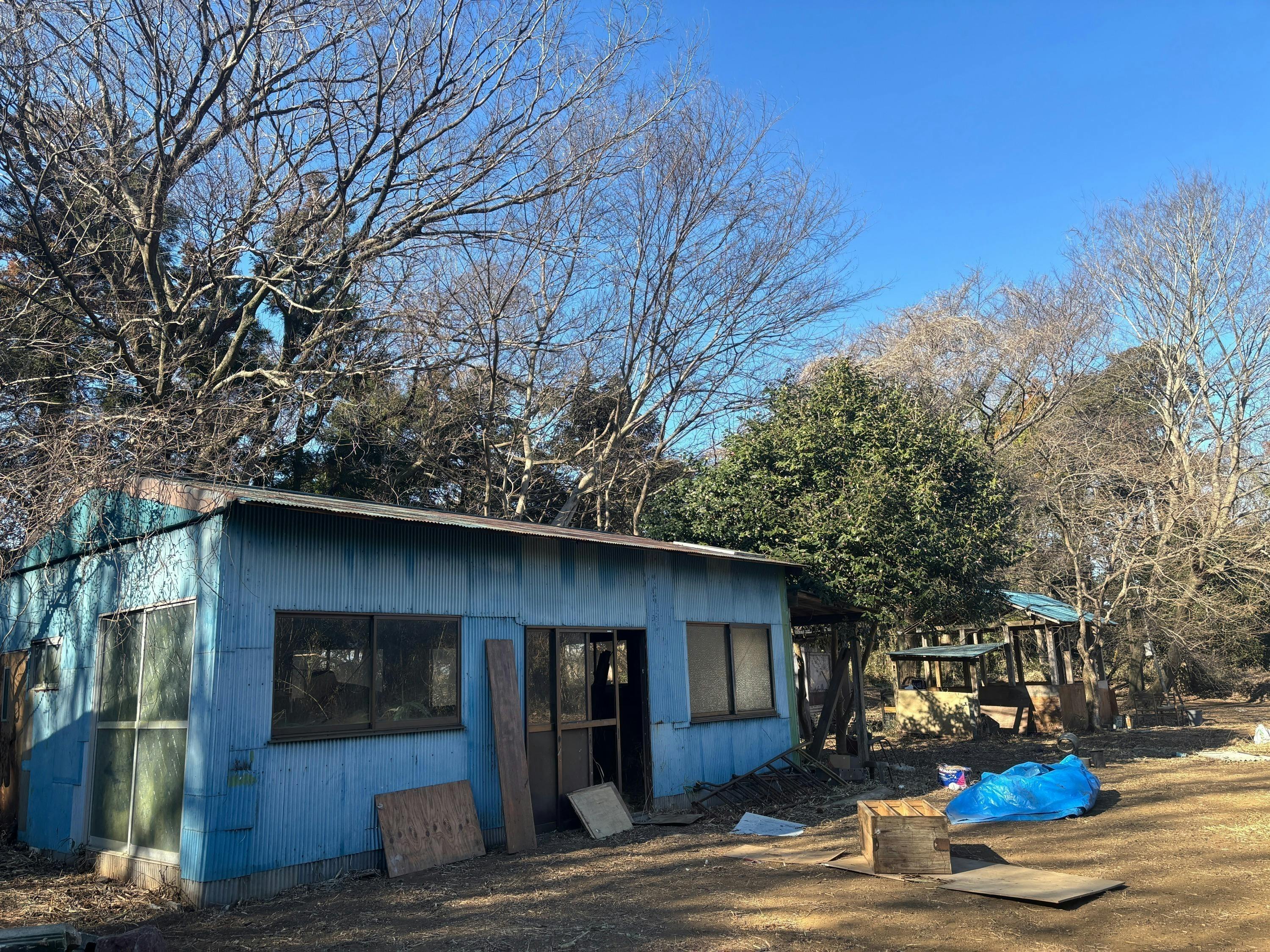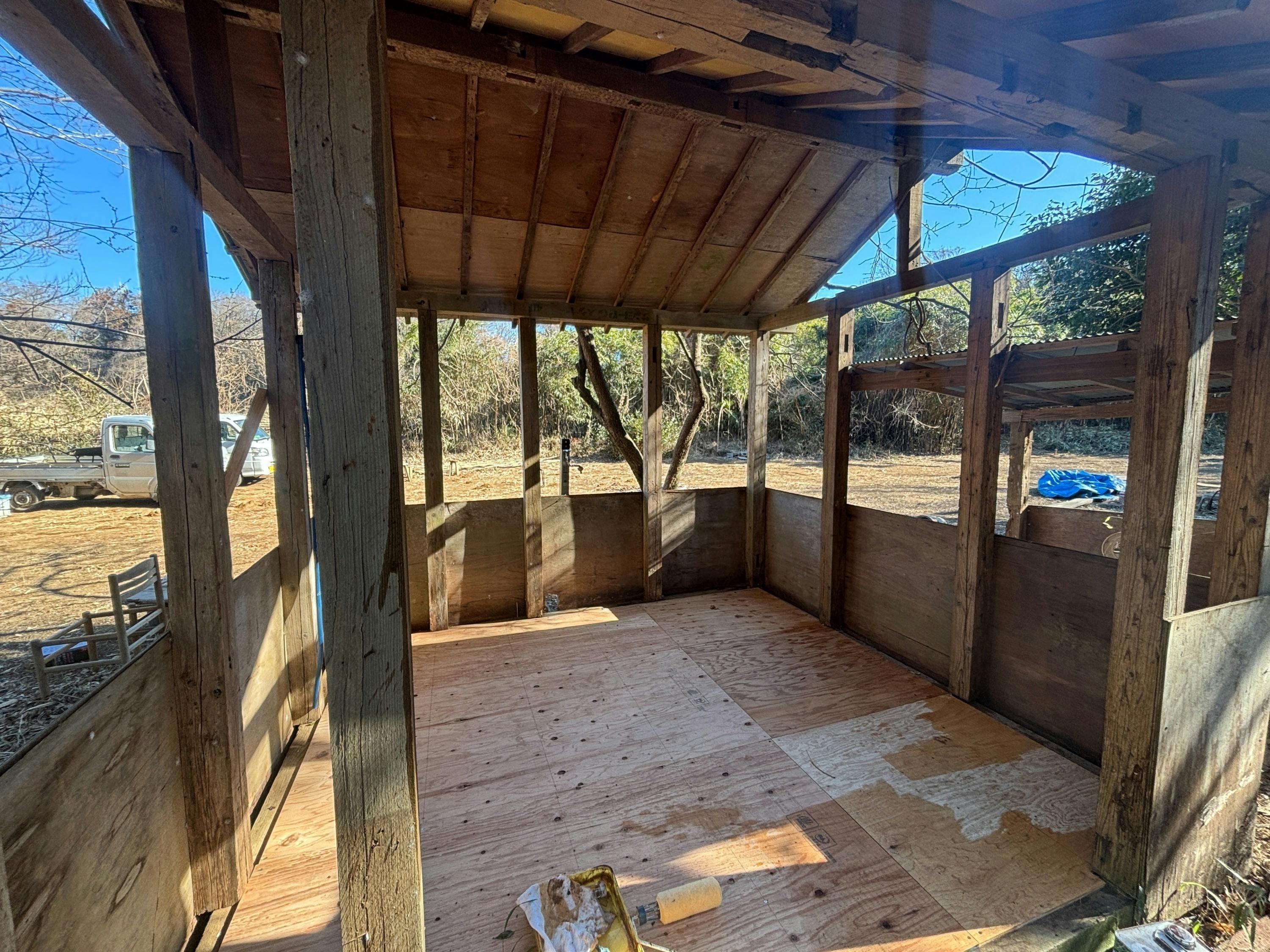 現状、作業小屋、屋外キッチン、コンポストトイレがすでに建っていますが、かなり年季が入っているので、床の張り直しやペンキ塗りなどが必要です。