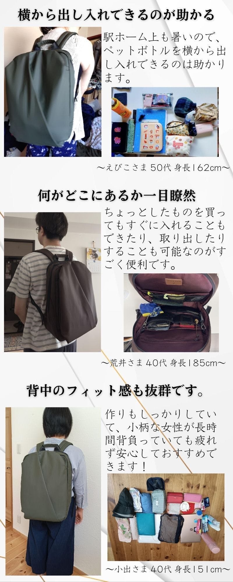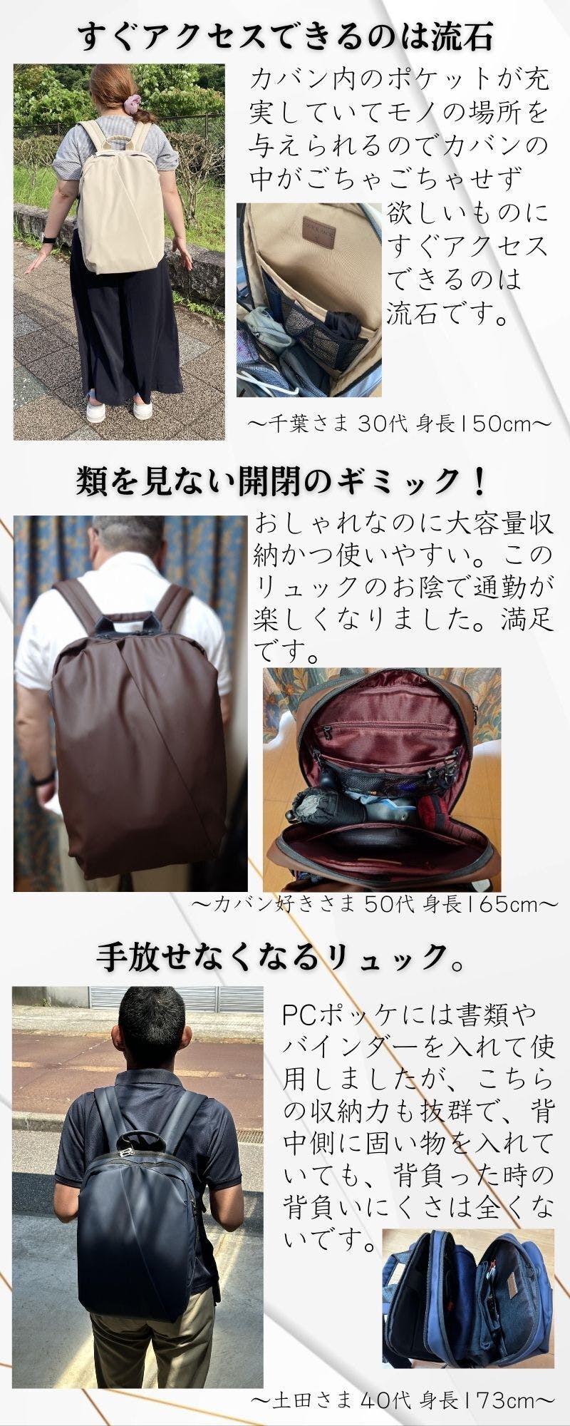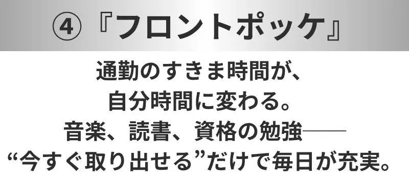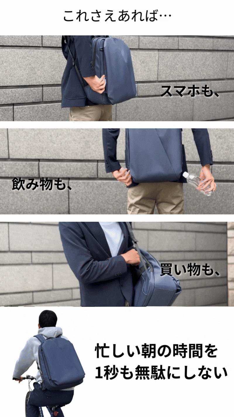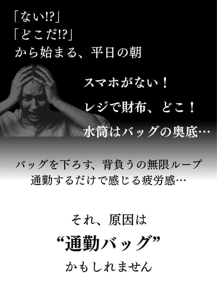 通勤、出張で移動が多い、パソコンをよく持ち歩く、スマホの出し入れが手間で嫌、荷物が取り出しにくいことにストレスを感じる、バッグをいちいち降ろさず荷物の出し入れがしたい、そんな方におすすめです。