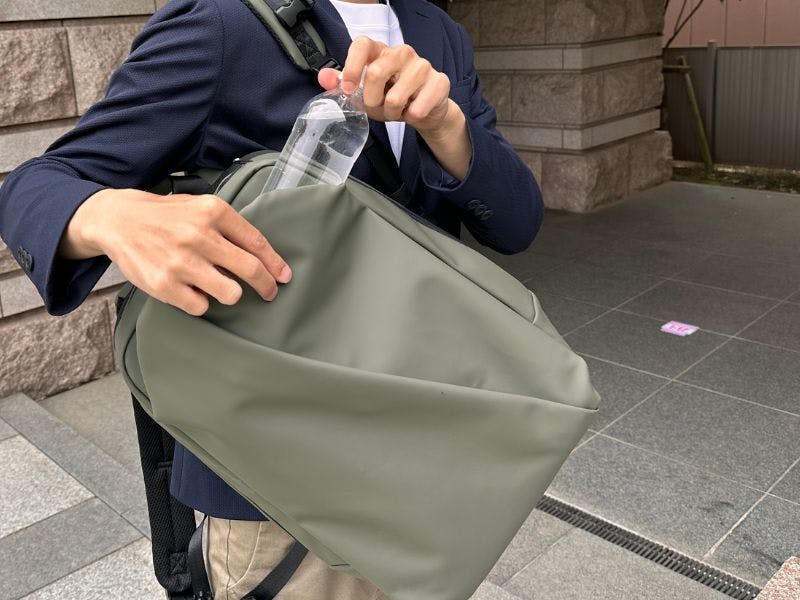 信号待ちのほんの数秒でも、いちいちリュックを降ろすことなくサッと水分補給ができます。