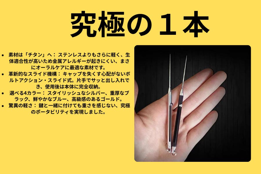 今回のネクストゴール挑戦にあたり、私たちがどうしてもラインナップに加えたかったのが、この純チタン製スライド爪楊枝です。ステンレス製も優れていますが、チタンには「究極の道具」と呼ぶにふさわしい、3つの絶対的なメリットがあります。