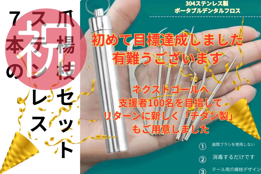 支援者の皆様こんにちは!YOUPLUS代表の生田です。 プロジェクト開始から間もなく、おかげさまで目標金額10,000円を達成いたしました!皆様からの温かいご支援、そして「こんな道具を待っていた」という期待の声をいただき、スタッフ一同、感謝の気持ちでいっぱいです。本当にありがとうございます。この反響を受けまして、私たちは「ネクストゴール(支援者100名)」への挑戦を決定いたしました!■ なぜ「チタン」を投入するのか?現在、ネクストゴールに向けて新しいリターンの追加申請を行っています。それが、画像にもある**「純チタン製・スライド式爪楊枝」**です。今回セットでお届けするステンレス製も自信作ですが、開発を進める中で「よりミニマムに、より高機能な1本を」という究極の選択肢を皆様に提示したいと考えました。チタンが「一生モノ」にふさわしい3つの理由:肌に優しい: 医療用インプラントにも使われる生体適合性で、口内でも安心。驚きの軽さ: 持っていることを忘れるほど軽く、鍵束に付けても邪魔になりません。タフな耐食性: 錆びに強く、過酷なキャンプ環境でも一生輝きを失いません。「ガジェット好き」な男性にはたまらない、ボルトアクション(スライド式)の操作感もこだわりのポイントです。■ 今後のスケジュールについて現在、キャンプファイヤー事務局へ追加リターンの申請を行っております。承認され次第、以下の条件で受付を開始する予定です。ネクストゴール限定価格:1,584円(一般価格の20%OFF)ネクストゴールペア割:3000円選べる4カラー(シルバー、ブラック、ブルー、ゴールド)審査が通り次第、改めてこちらの活動報告にてお知らせいたします。「たかが爪楊枝、されど爪楊枝」。 この小さな道具が、皆様の食事の時間をよりスマートに変える一助となれば幸いです。引き続き、本プロジェクトの拡散・応援をどうぞよろしくお願いいたします!