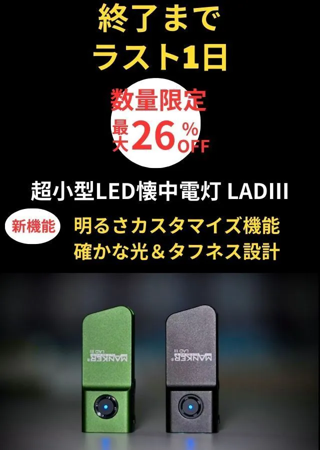 2026/03/17 18:30MANKERの超小型懐中電灯 LAD Ⅲの魅力をこれまでお伝えしてきました。これまでご紹介してきた、サイズ、明るさ、光の色、調光、ムーンライト。それらはすべて、毎日使う道具であることを前提に考えた結果です。■ 持ち歩けることを、当たり前にLAD Ⅲ は、「たまに使うライト」ではなく、常に持ち歩けるライトを目指しました。親指サイズの大きさとフラットで邪魔にならない形状は、そのための選択です。(写真1枚目)■ 使いやすさを重視した光十分な明るさがあり、光の色を選べて、必要に応じて細かく調整できる。(写真2枚目)LAD Ⅲ は、使う場面を想像して設計されたライトです。■ いつもそばにある道具LAD Ⅲ が目指したのは、単に明るく照らすライトではなく、気づいたら使っているライト、いつても持ち歩いているライト。そうした積み重ねを大切にして、このライトは作られています。ぜひ、MANKERの超小型LED懐中電灯 LADⅢ、お手にとって頂けたら嬉しいです。最後まで読んで頂きありがとうございます! もっと見る