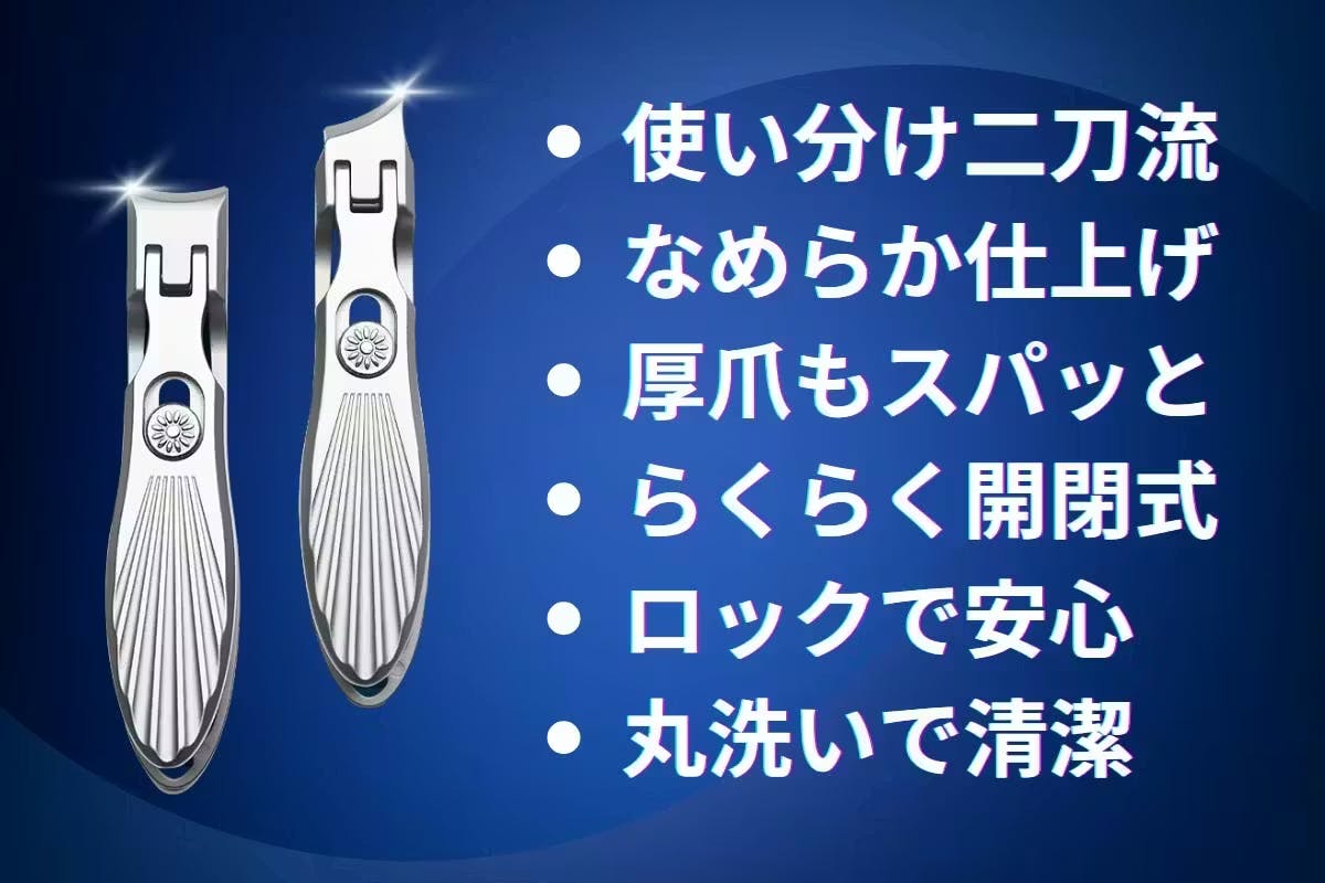 そこで誕生したのが、爪切り二本組『Twin Edge』です。曲線刃と斜め刃の“二刀流”で、手・足・巻き爪・ささくれなど幅広く対応。さらに飛び散りにくい刃構造、水洗い可能な高耐久素材、ロック付き折りたたみ設計など、快適さにもこだわり抜きました。