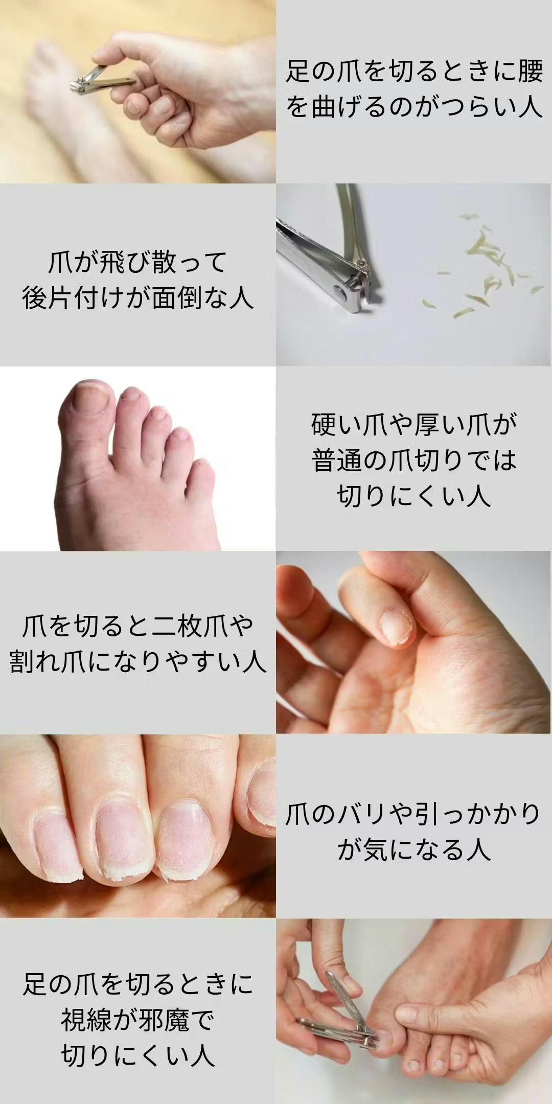A. 手の爪・足の爪・巻き爪など、さまざまな形の爪に対応しており、男女問わず幅広い方におすすめです。ご家族での共有やギフトにも最適です。