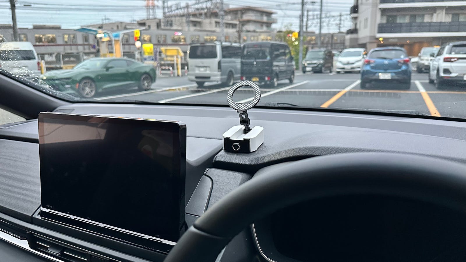 MagPosiは車内でも活躍する多機能スタンド。前席ではダッシュボードに付属のメタルステッカーを貼り付けることで、マグネットでしっかり固定でき、スマホをナビとして使用可能。