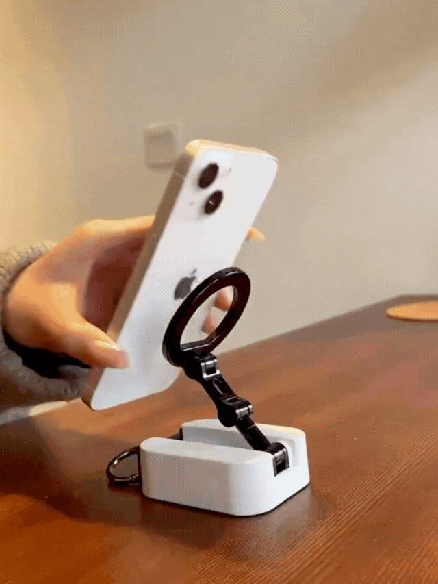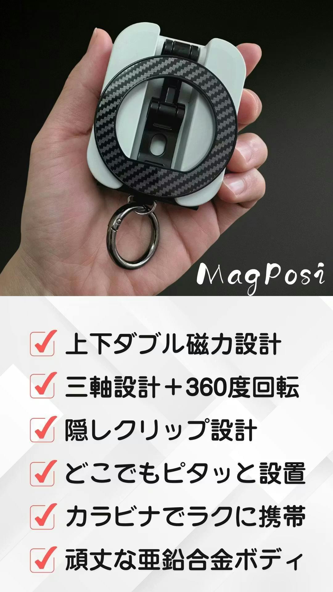 「MagPosi」は、スマホの設置や角度調整の悩みを解消する多機能スタンド。ダブルマグネットで安定固定、隠しクリップで設置自由。三軸構造で角度も自在、持ち運びにも便利です。