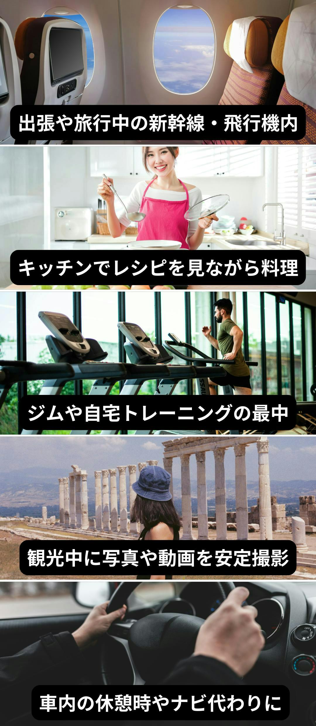 おうちでの動画視聴、キッチンでのレシピチェック、外出先での撮影や通話など、使い方はいろいろ。場所もシーンも選ばず、“こんな時にあったらいいな”を叶えてくれる便利スタンドです。