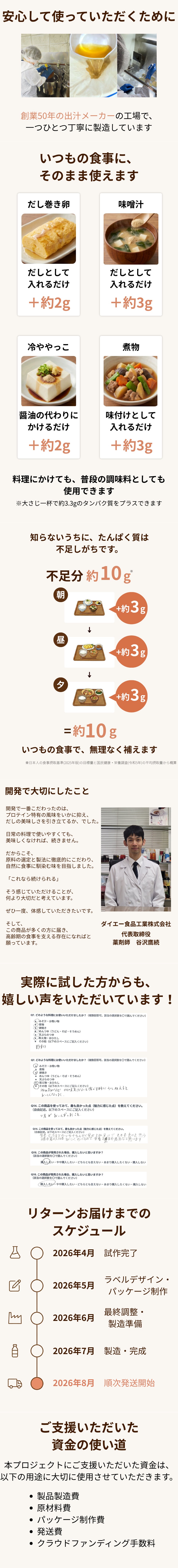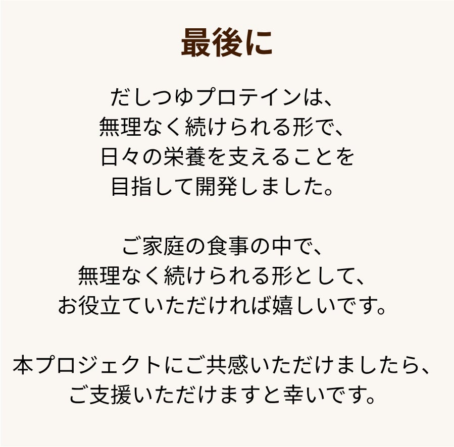 「だしつゆプロテイン」3本セット(ギフト仕様) 贈り先の住所・氏名・のしの有無(のし”あり”の場合は表書きと贈り主名)を、備考欄にご記入ください。 ・容量:500mL(1本あたり) ・容器:瓶 ・保存方法:直射日光を避け、冷暗所に保存。開封後は要冷蔵。 ・賞味期限:製造日から約6ヶ月 ・原材料、主原料の原産地: コラーゲンペプチド(ゼラチンを含む)(国内製造)、しょうゆ(本醸造)(大豆・小麦を含む)、砂糖、風味原料(いわし、さば、かつお)、清酒、食塩、酵母エキス ・添加物表示、アレルギー表示:ゼラチン、大豆、小麦 ・ギフト仕様:簡易ギフト包装(箱+ラッピング) ・配送先:支援者様指定の住所へお届け可能