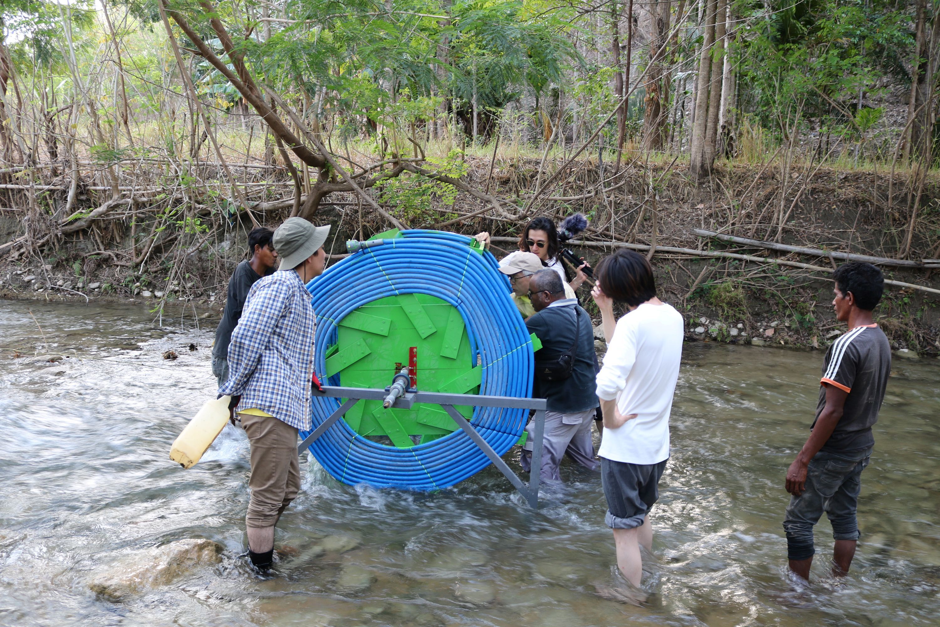 水車にスパイラル状にホースを巻き付けたポンプで、川の流れで回転して水をくみ上げることができます。したがって、燃料がいらず、24時間運転し続けることができます。また、構造が単純なので現地で組み立て、修理ができ、持続的に利用することができるのが特徴です。