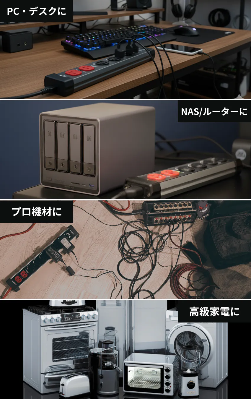 A. パソコン、NAS、Wi-Fiルーター、テレビ、ゲーム機、オーディオ機器など、家庭用コンセントを使用する多くの機器に対応しています。