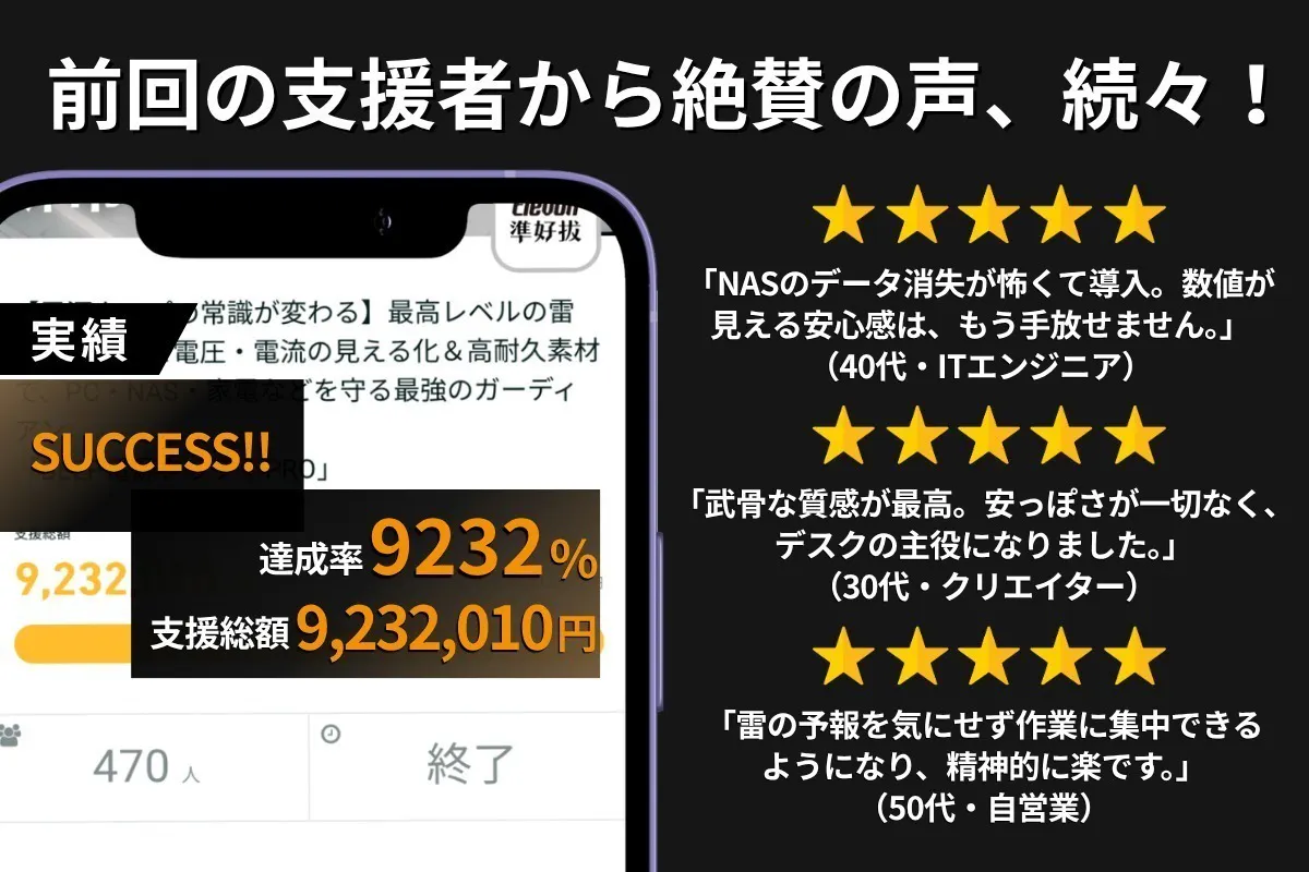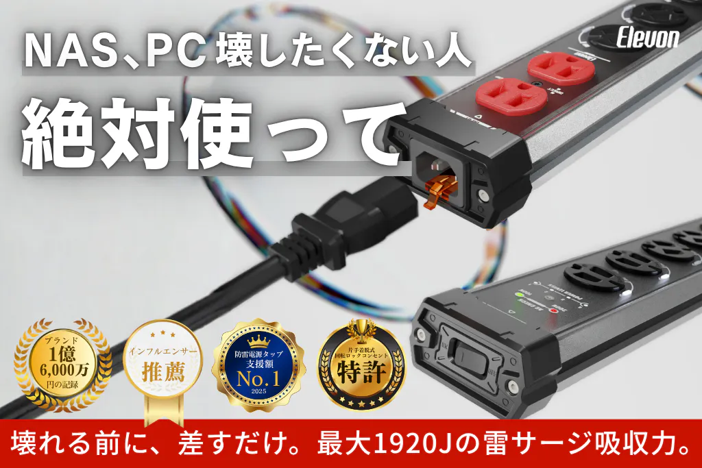 【累計1.6億円突破】大切なPC・NAS・家電を落雷や電圧トラブルから「差すだけ」で守る、プロ仕様の最強電源タップ。最大1920Jの雷サージ吸収&電圧・電流の見える化&高耐久素材で、機器破損や火災リスクも大幅低減。機材・データを守り抜く、最強の「保険」「安心」を、今だけCAMPFIRE限定価格で。