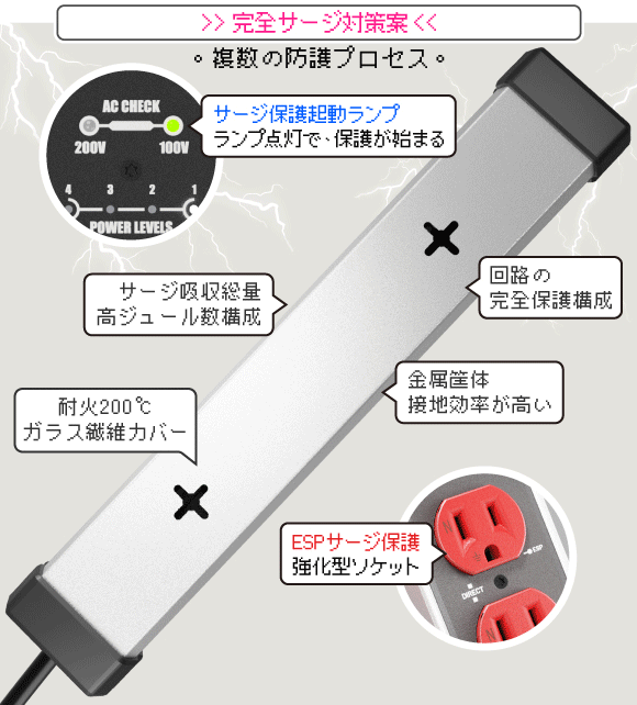しかし一般的な電源タップよりも大きな1920Jのサージ吸収容量を備え、機器保護を目的として設計されています。