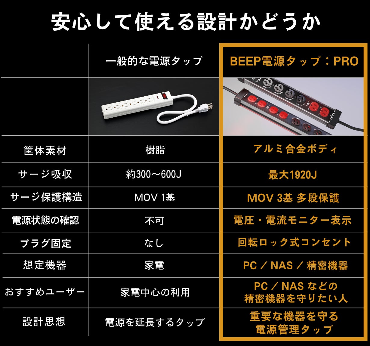 A. 一般的な電源タップは「電気を分ける」ための製品ですが、BEEP電源タップ:PROは機器を守ることを前提に設計された電源タップです。雷サージ吸収構造や異常検知機能により、異常時には警告や電源遮断で、機器保護をサポートします。