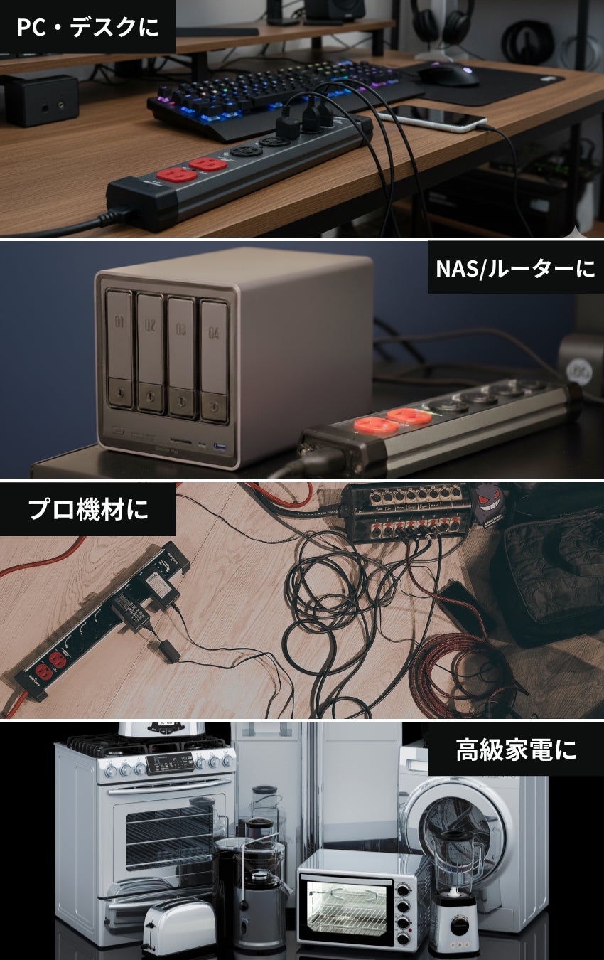 A. パソコン、NAS、Wi-Fiルーター、テレビ、ゲーム機、オーディオ機器など、家庭用コンセントを使用する多くの機器に対応しています。