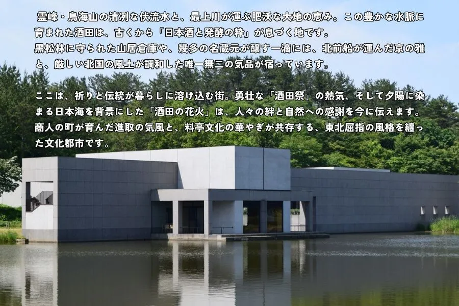また、鳥海山からの清冽な伏流水と豊かな大地を背景に、古くから日本酒の名産地として発展してきました。全国的にも名高い銘酒の数々、そして寒冷な気候と豊かな土壌が育んだブランド米「つや姫」、日本海の荒波が育む旬の魚介類や伝統的な食文化は、国内外から訪れる人々を魅了し続けています。