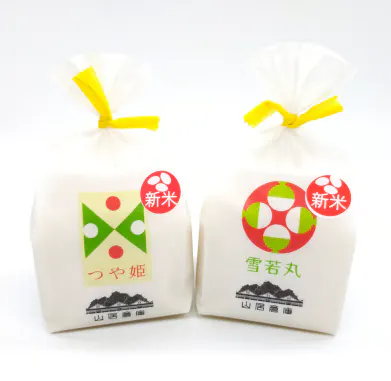 ●つや姫 (販売者:庄内米穀(株)) ツヤがあり、甘みと香りが抜群のお米です。 山形を代表するブランド米。お米はここまで美味しくなれる。 名のとおり「白く輝くつや姫」。最高級の旨みをご堪能下さい。 内容量:2合(300g)  ●雪若丸 (販売者:庄内米穀(株)) 大粒で食べ応えがあり、あっさりと上品な味わい。一粒一粒がしっかりとした弾力があり、カレーやチャーハンにしても負けない存在感があります。 どんな料理にもマッチする、新定番のお米です。 内容量:2合(300g)