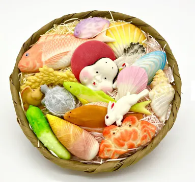 江戸時代末期に北前船によってもたらされ、湊町酒田で醸成された上方文化の一つである「飾り菓子」を日本工芸和菓子の技法を基に復刻した「湊酒田の飾り菓子」です。  伝承の木型と製法を活用し海の幸、山の幸、縁起ものなど、伝承の雛菓子の面影そのままに再現してあります。  「小松屋又三郎」はかつて酒田にあり、市民に親しまれた菓子の名店「小松屋」の創業以来の屋号です。
