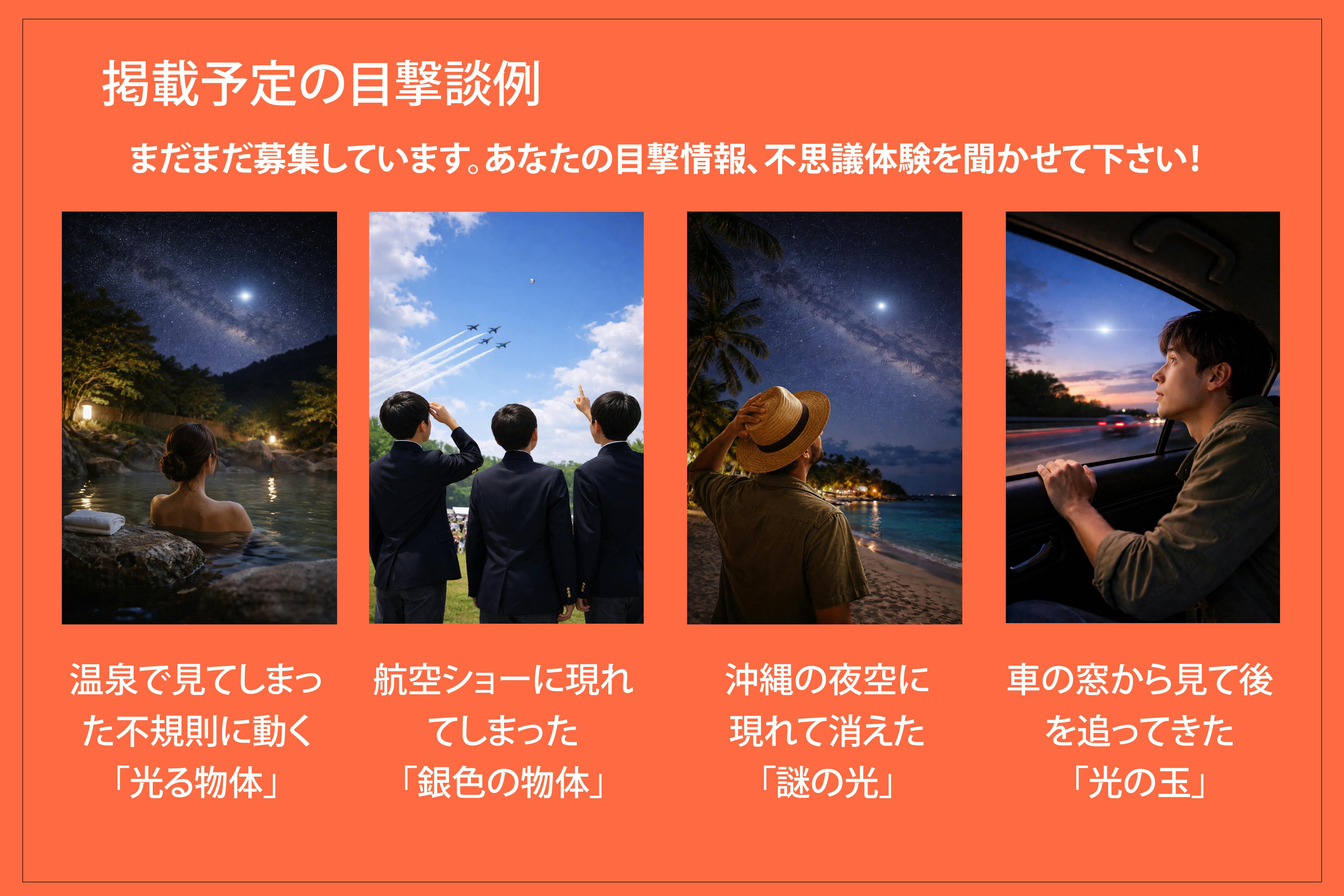 私たちは、これまでの活動を通じて、数多くのUFO目撃者が体験を証言することに躊躇している現状を目の当たりにしました。あなたの友人や知人に質問してみて下さい。実は、そうした人たちはびっくりするぐらいたくさんいます。単なる「見間違い」や「思い込み」だったのかも知れません。しかし、これらの体験者たちの声を、ただの「戯言」として葬り去ってしまうのはあまりにも惜しいことです。そこで、私たちは彼らの声を電子書籍という形で記録し、広めることを決意しました。このプロジェクトを通じて、UFOやUAP現象が、ただの「都市伝説」で終わる事ではなく、現実的な問題として認識される事への手助けになると思っています。