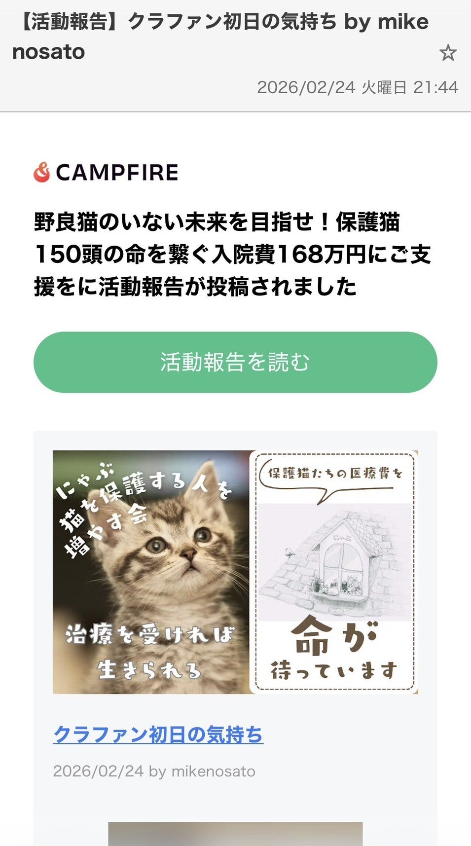 2026/03/31 12:53こんにちは、猫の伊藤です。2月24日に始まったクラウドファンディングも、いよいよ最終日となりました。残り11時間です。ここまでご支援・ご協力くださった皆様、ありがとうございました。お陰様で目標額を達成できました。目標額を超えて、さらなるご支援をいまもいただいております。2月の入院費用に使わせていただきます。今回のクラファンを始める前に、いつまでの不足分を呼び掛けるか、迷いましたが前月の1月までは確定していたため、そこまででを呼び掛けることにしました。2月が終わり、いま、3月も終わろうとしています。カレンダーに関係なく、毎日入院費は発生していて、毎月、入院費はお支払いしなければなりません。もし可能ならば、ご支援をいただけるとありがたいです。ここまで読んでいただき、ここまでご支援いただき、本当にありがとうございました。明日からは新年度となります。姿勢は変わらずに、進みます。保護が必要ない日が来るように。野良猫のいない未来は必ず来ます。 もっと見る