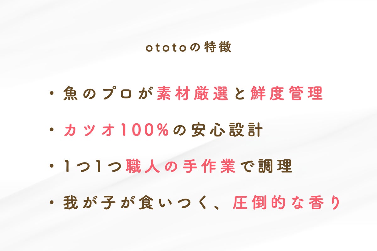 お肉や乳製品に対してアレルギーの不安がある子でも、原料にカツオだけしか使っていないototoなら、それらに代わる安心なたんぱく源として取り入れていただけます。一般的にお魚はアレルギーの発生率が低いとされている原料です。【「食いつき」を改善したい時に】