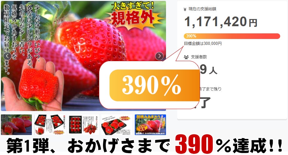 ご支援者様にご好評いただき、前回の【規格外あまおうプロジェクト】は、おかげさまで390%達成することができました。