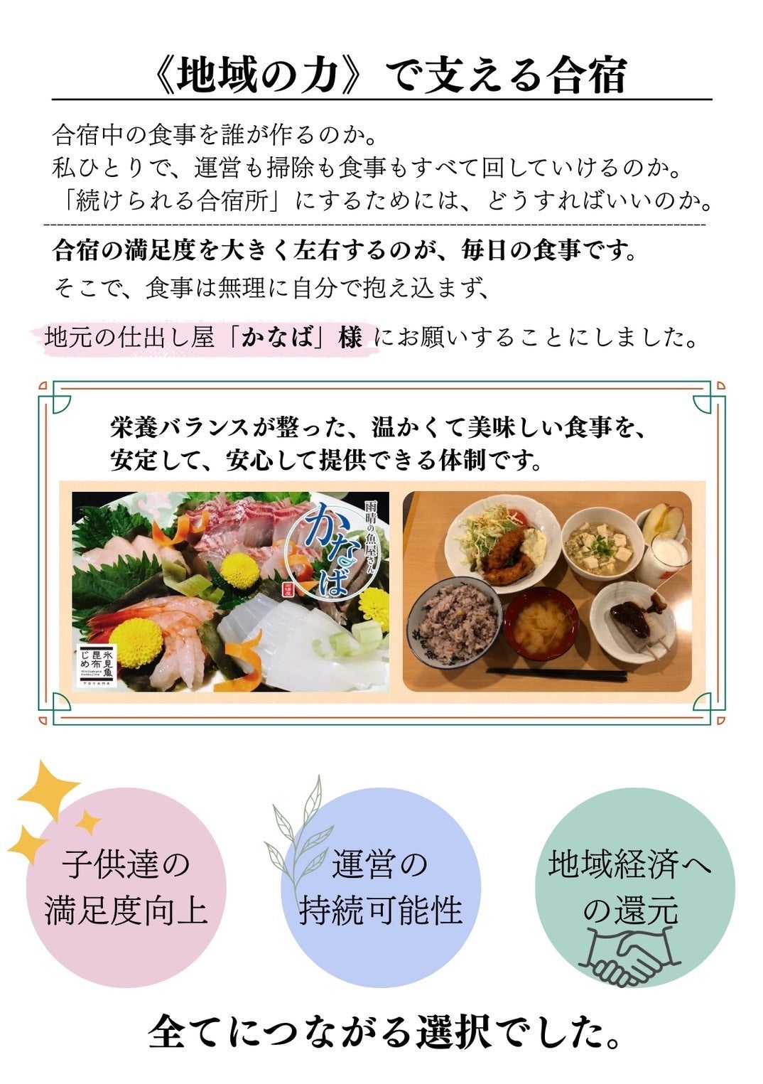 合宿や遠征のサポートを行う中で、短時間の指導では生まれない、共同生活だからこそ育つ成長を何度も目の当たりにしてきました。中学生の頃、ハンドボールの全国大会に出場するために大阪から氷見に泊まりにきたことがあります。大阪で育った僕にとっては、地域の方と一緒に過ごす民泊体験はとても印象的で、今でも心に残っています。